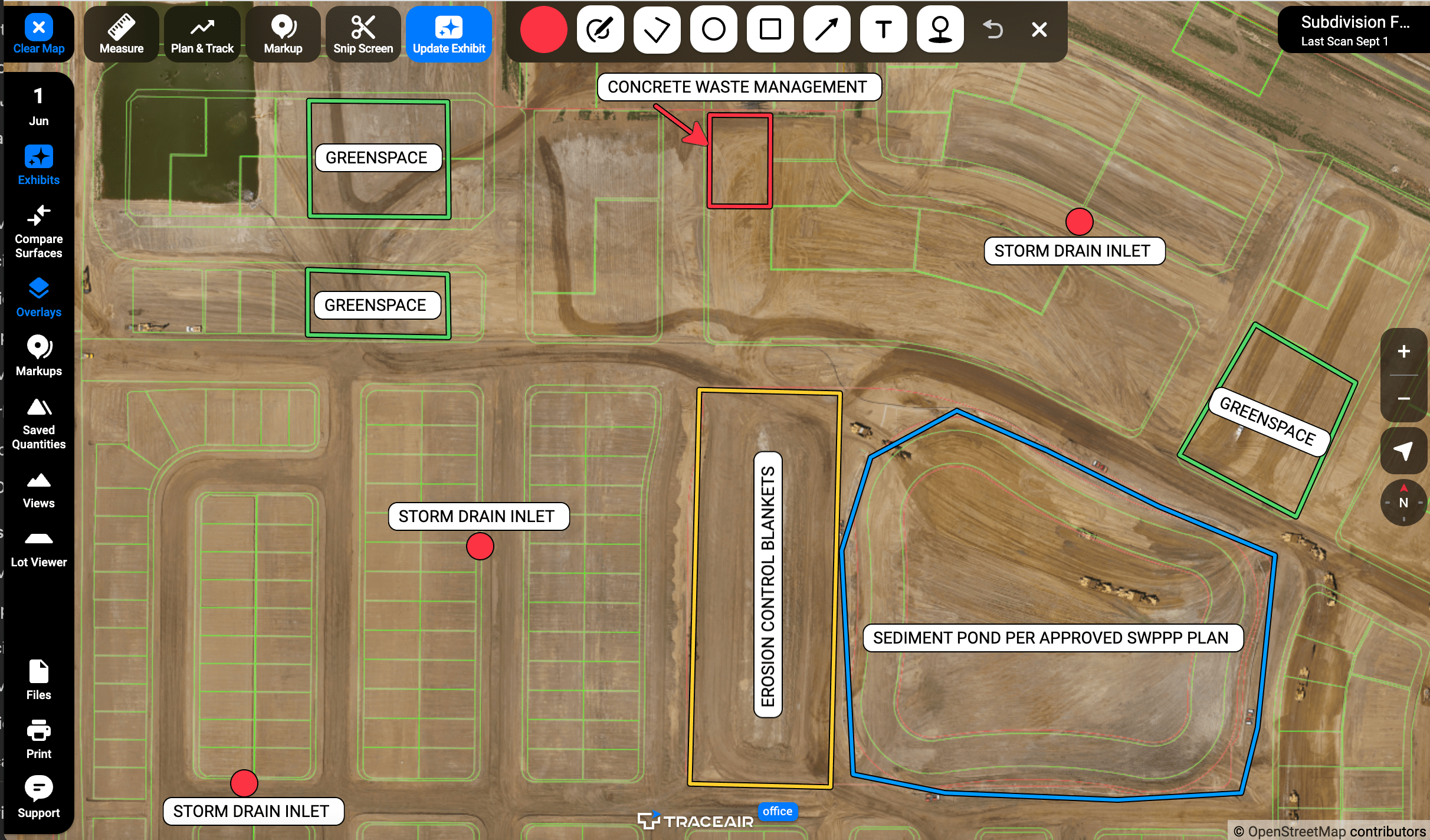 TraceAir revolutionizes the entitlement process through a multitude of innovative tools. Our overlays tool empowers you to strategically plan and optimize land usage, unlocking its full potential and ensuring compliance. Overlays help mitigate risk by making sure plans align with the land and as-builts. Additionally, our precision measuring tools provide the accuracy needed to meet greenspace, SWPPP, and various other compliance standards with confidence.