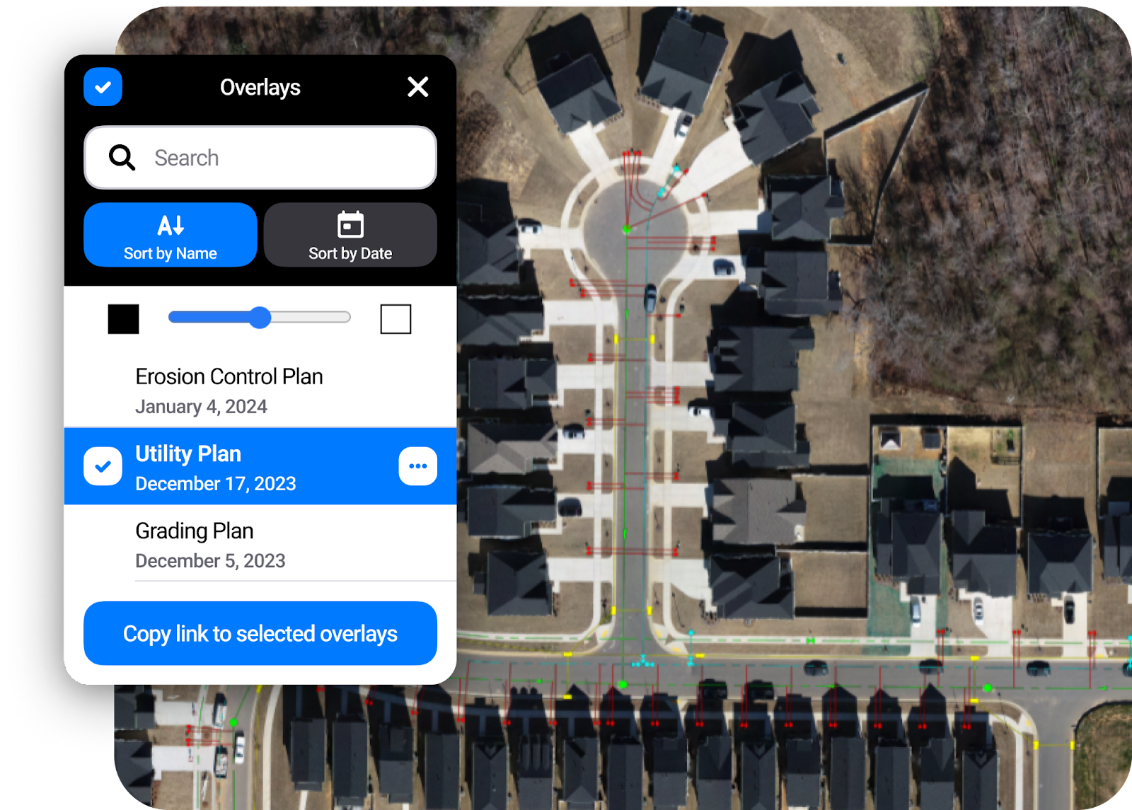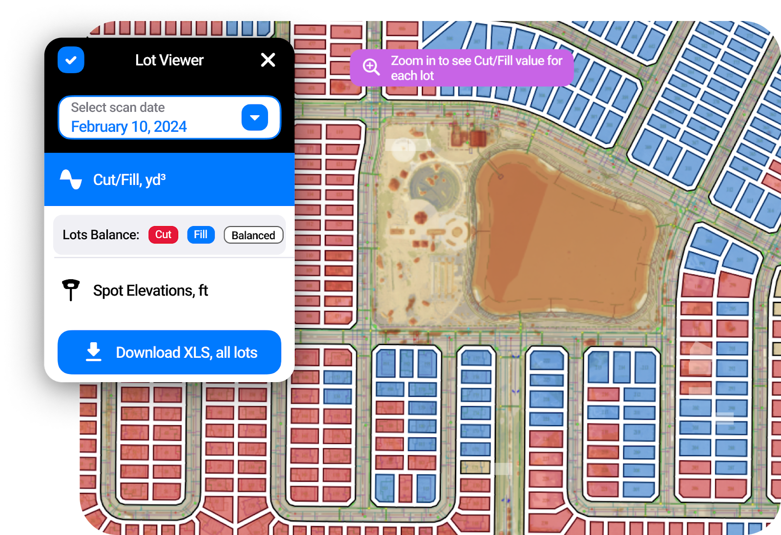 Earthwork & Lot Grades: With advanced tools for earthworks, TraceAir enables users to easily understand cut/fill quantities of their entire projects down to individual lots. The cut/fill balance tool shows a heat map of the current state of the project compared to the design grade, for easy visualization of how much cut or fill is needed. A standout tool for homebuilders, Lot Viewer provides precise cut/fill quantities and elevations for individual lots, streamlining the grading process and eliminating the need for repetitive surveys.