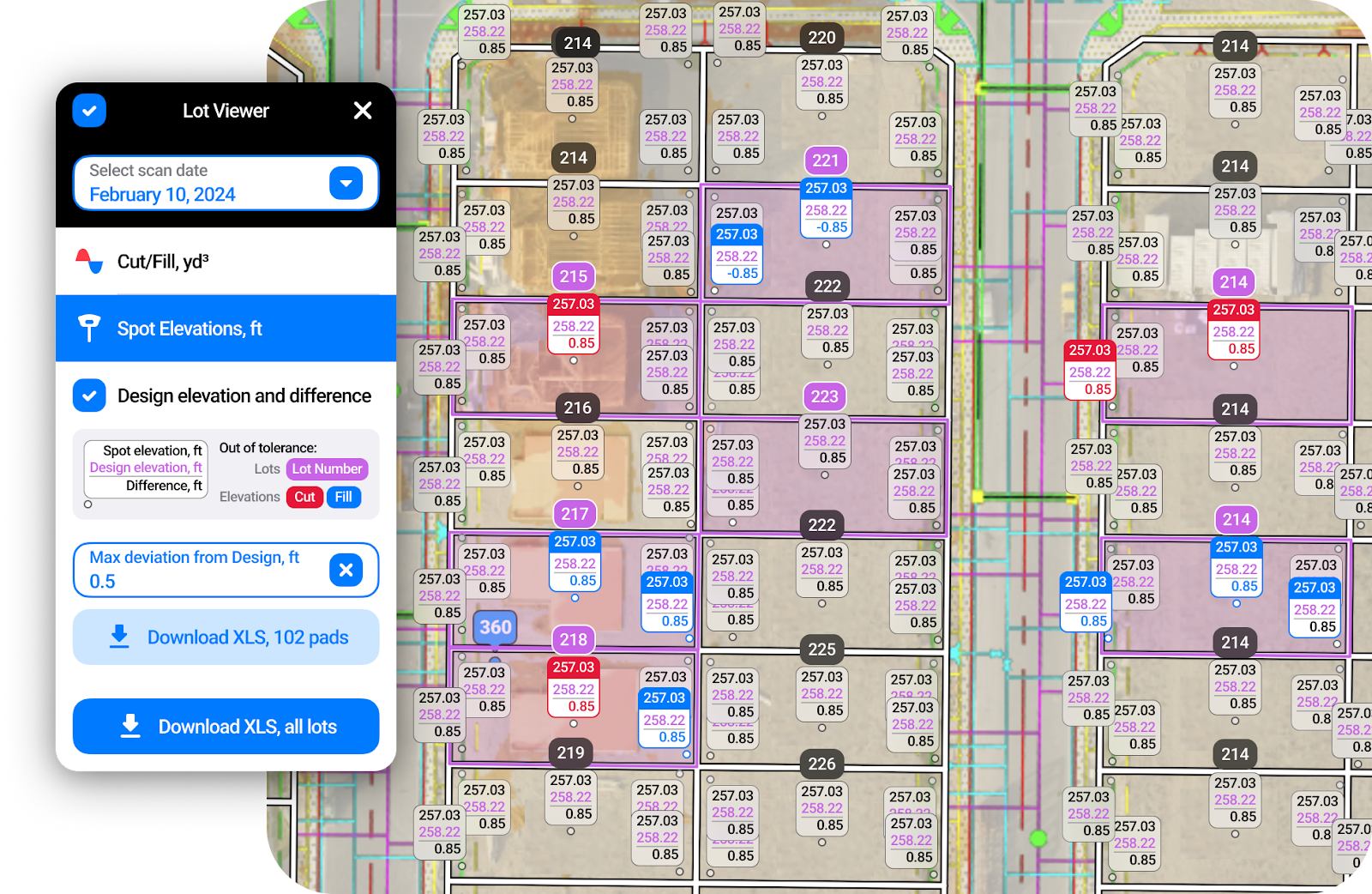 We use Lot Viewer on all of our projects, and it’s quickly becoming our favorite tool within TraceAir. It allows our teams to pinpoint exactly which lots require attention and the specific areas in need of adjustments. This not only minimizes additional surveying expenses, but also accelerates project timelines overall with cleaner/clearer lot handoffs from sitework contractor to vertical production. This is where we experience the most significant time savings.”