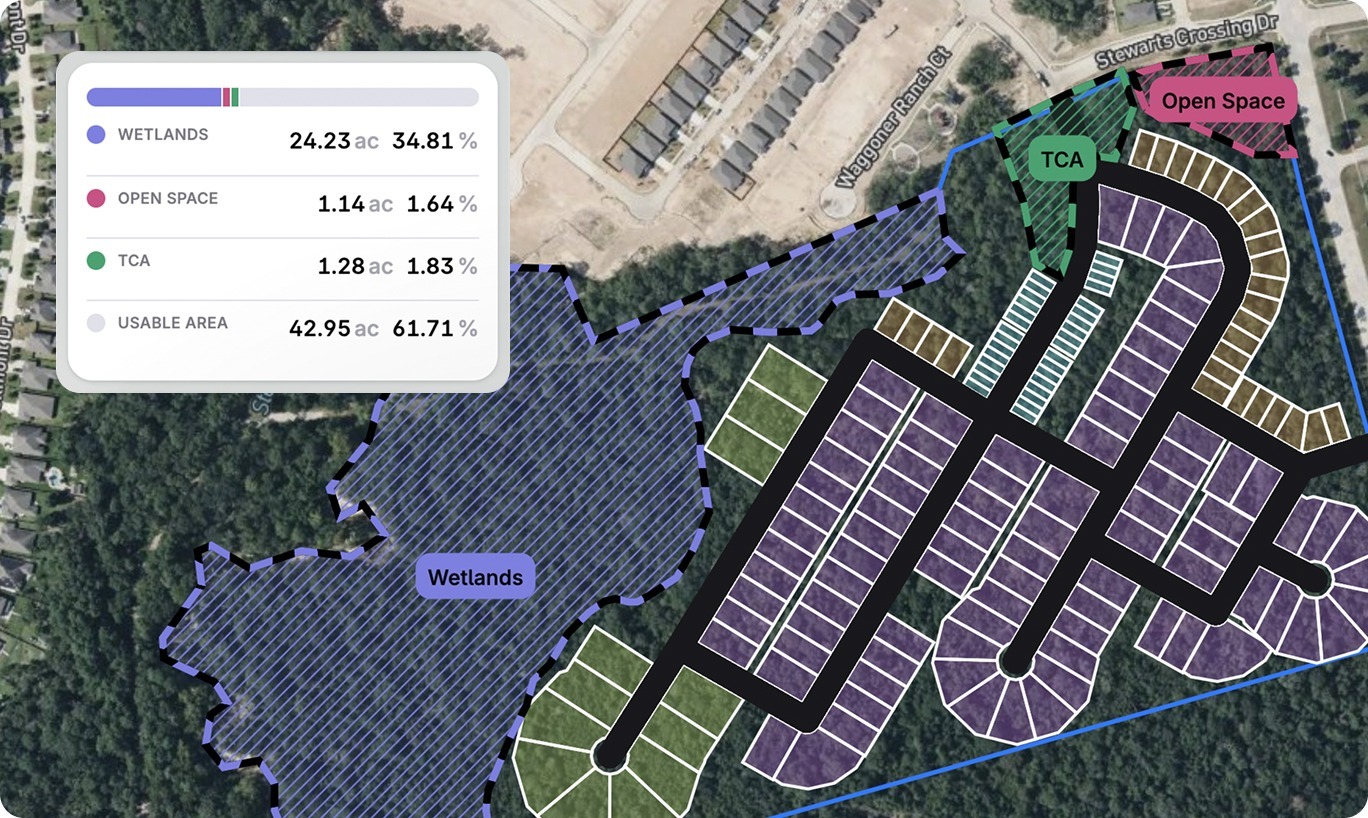 Restricted areas are no longer just visual overlays. The tool now calculates metrics in real time—showing you exactly how much area is restricted versus buildable, and what percentage of your site is impacted. If a wetland buffer is eating into your yield more than you thought, you'll see it immediately. That visibility changes how you negotiate and how you decide whether a deal makes sense.