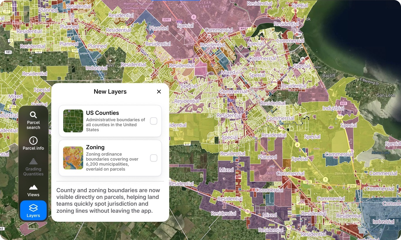 We've also added county boundaries with full US coverage, giving you jurisdictional context at a glance. Add in the new contour layer, and you have a much clearer picture of terrain and grading challenges.